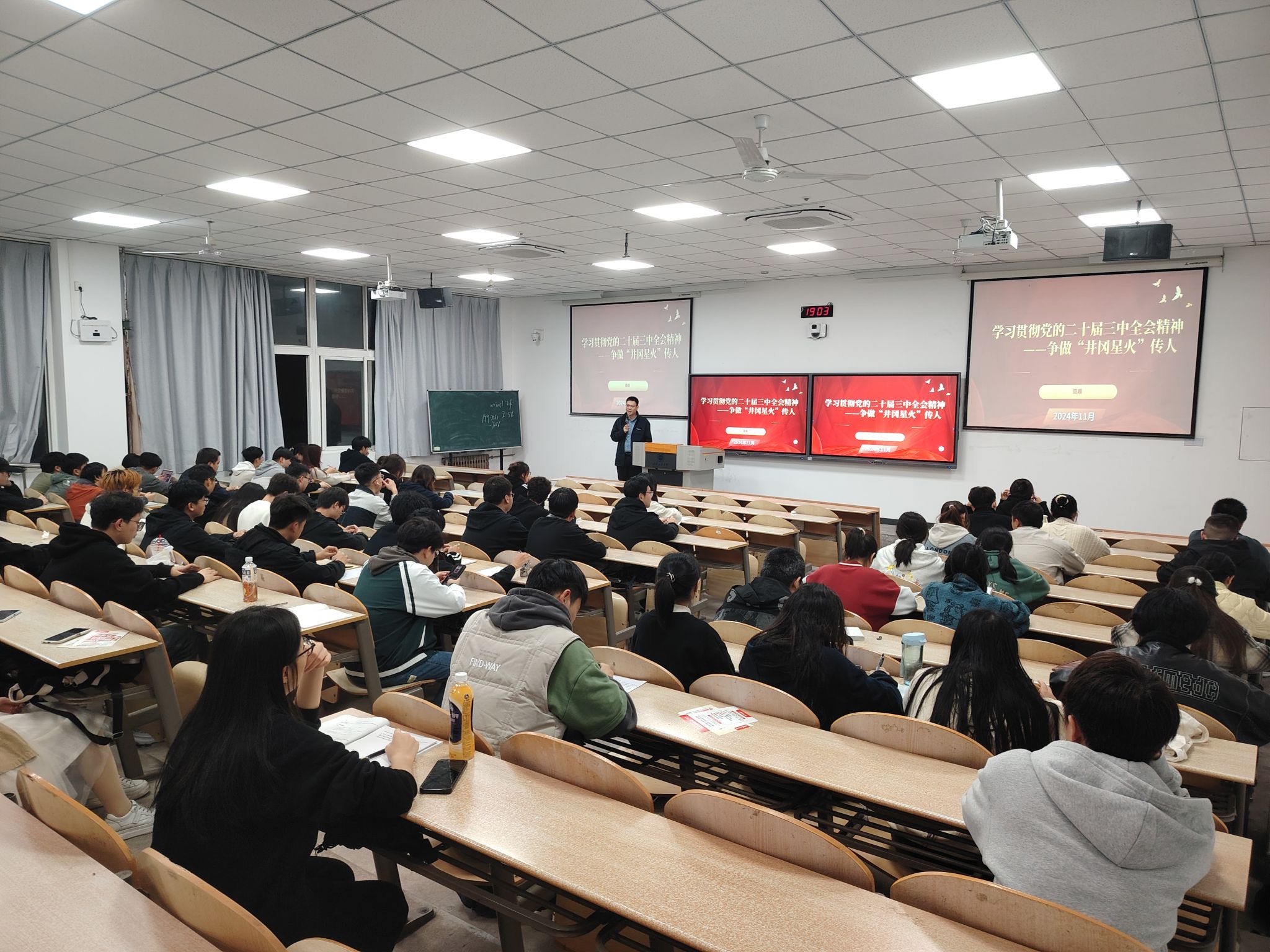 周顺以“学习贯彻党的二十届三中全会精神——争做‘井岗星火’传人”为主题进行讲授。他以中国共产党人的精神谱系概述、井冈山精神、井冈山精神与当代青年为主要内容进行讲解,并播放相关视频。他为同学们讲述了井冈山革命根据地的建立、曲折发展、后期斗争以及井冈山精神的丰富内涵等内容,向同学们介绍了井冈山这个伟大的红色革命根据地,让大家更好的从中了解党的艰辛发展历程。他从大学生要坚定崇高革命信念、要有无私奉献和艰苦奋斗精神、要有创新精神、要有诚信精神等方面对入党积极分子提出了殷切希望。