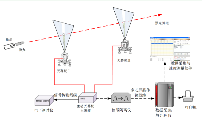 针对超高速飞行弹丸,采用高速光电探测器件和高速信号处理电路,研制TM1102型高速天幕靶,可用于2800m/s超高速弹丸速度的测量。针对天幕靶全天候使用的技术需求,研制TM1103型主动天幕靶,设计有主动照明光源,不依赖天空的自然光。通过探测弹体表面反射回微弱变化的光能量,进行信号拾取放大,输出弹丸的过靶信号。特别适合于晚上使用,具有较强的抗炮口火光和冲击等干扰能力。