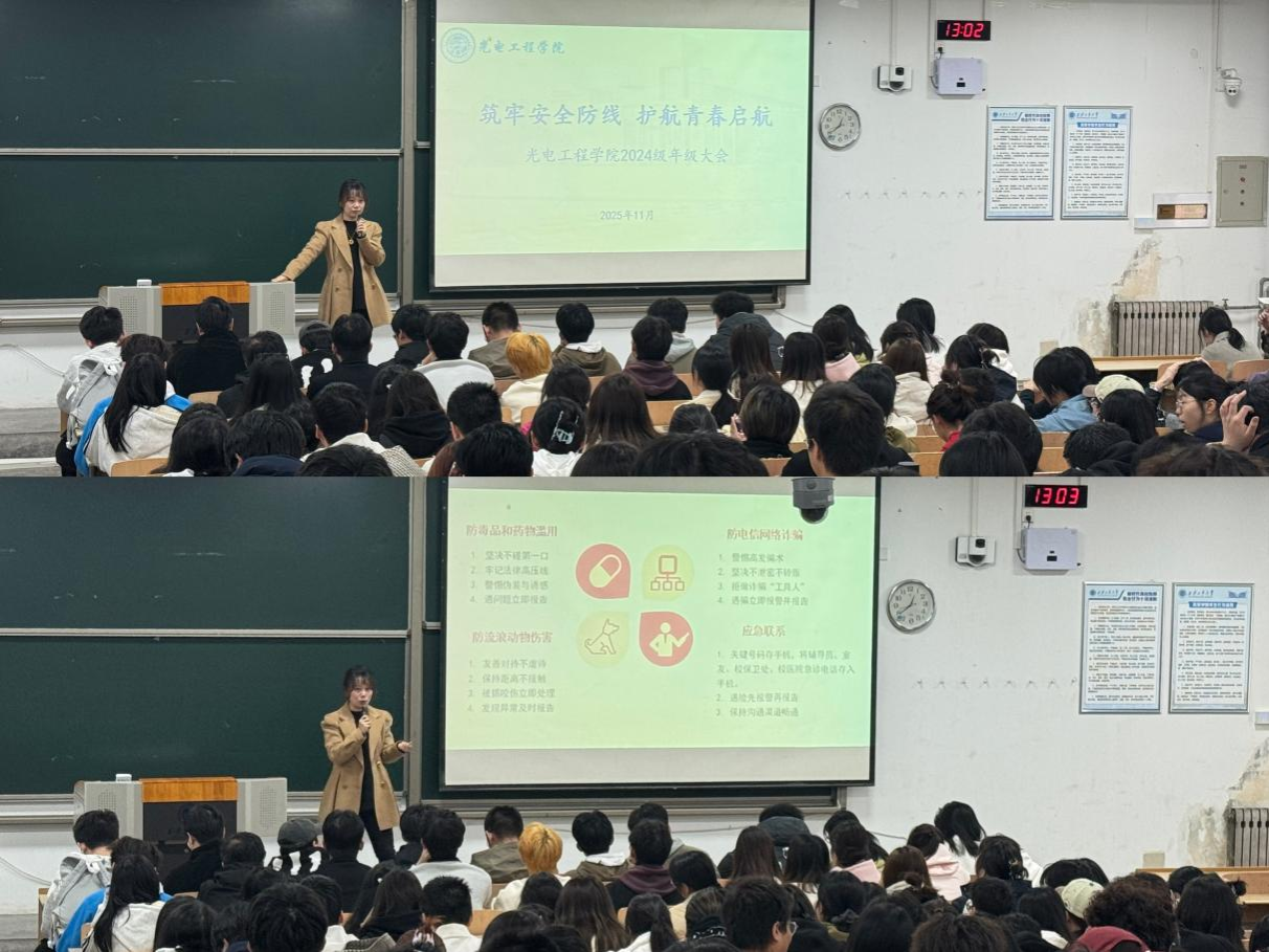 组织2024级召开“筑牢安全防线 护航青春启航”主题年级大会。此次大会由辅导员蒋紫洮主持,2024级全体学生参会。
