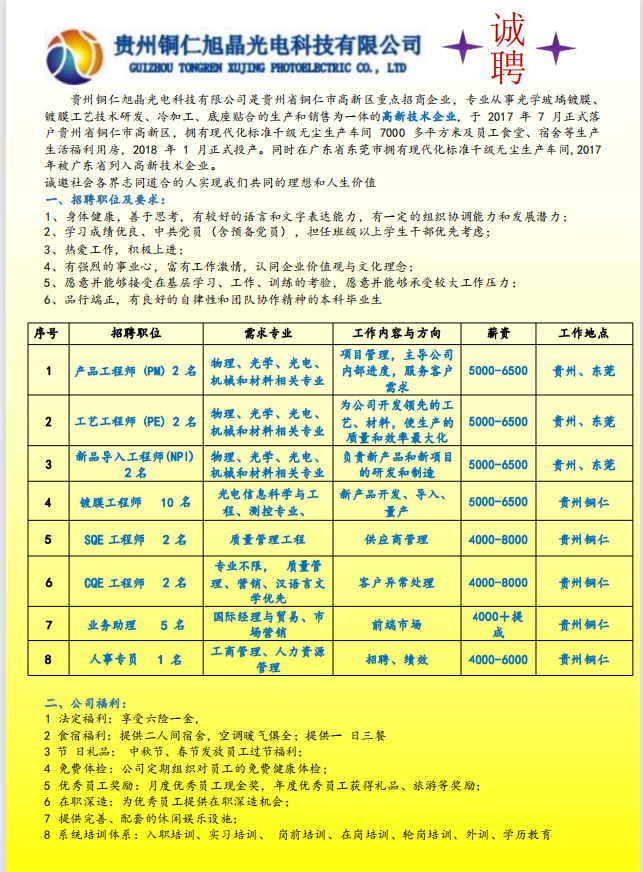 贵州铜仁旭晶光电科技有限公司招聘