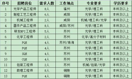 1、工作地点: 福州、珠海、苏州、铜陵、咸阳 2、需求专业: 物理学、光学、电子、通信相关、光电工程、光电子、机 械、自动化、电气、材料、化学、人力资源、工商管理、信息管理等