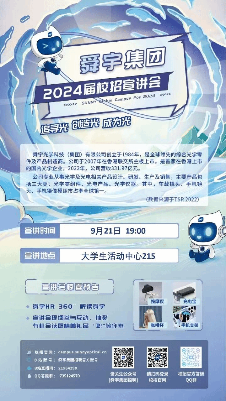 香港上市公司舜宇集团2024届校园招聘已经启动(9月21日大学生活动中心215)