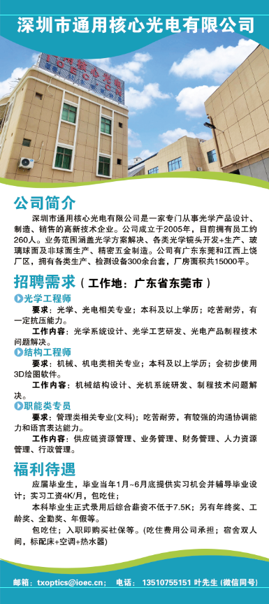 要求:光学、光电相关专业;本科及以上学历;吃苦耐劳,有一定抗压能力。