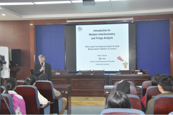 硕博士研究生和相关专业教师参加。报告中武田光夫教授回顾了光学干涉技术的发展历程与进展,结合干涉测量原理,对其发明的“通过傅里叶变换方式进行条纹分析”技术进行了详细和生动的阐述,并与师生进行了充分交流和讨论,对提出的专业问题作了详细的解答。