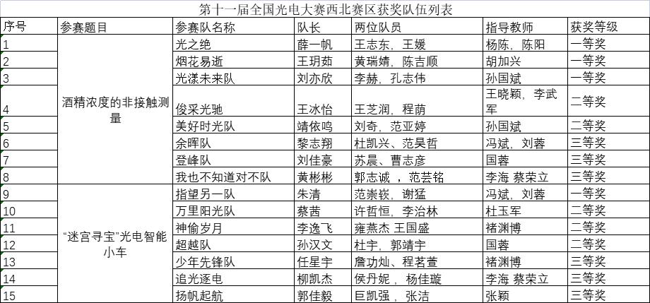 本次比赛为分为酒精浓度的非接触测量和“迷宫寻宝”光电智能小车两个实物赛道,经过校赛和网评初赛,15支队伍进入西北区决赛,其中酒精浓度的非接触测量中的3支队伍和“迷宫寻宝”光电智能小车中的1支队伍共计4支队伍获西北区赛一等奖直接晋级国赛,酒精浓度的非接触测量中的2支队伍和“迷宫寻宝”光电智能小车3支队伍共计5支队伍获得西北赛区二等奖,酒精浓度的非接触测量中的3支队伍和“迷宫寻宝”光电智能小车3支队伍共计6支队伍获三等奖。