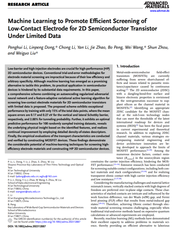 董林鹏副教授/刘卫国教授带领的宽禁带半导体光电器件科研团队在国际顶级学术期刊《Advanced Materials》(IF=29.4)上发表了“Machine Learning to Promote Efficient Screening of Low-Contact Electrode for Two-Dimensional Semiconductor Transistor Under Limited Data”学术论文,我校蚂蚁足球
