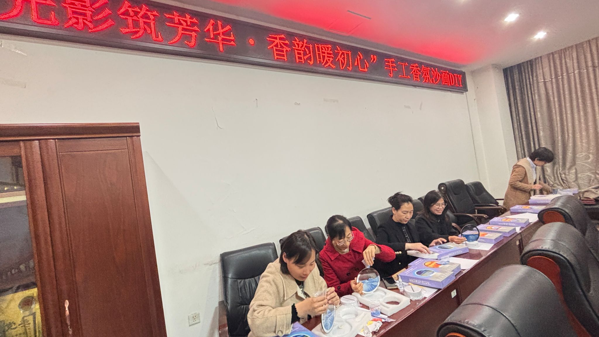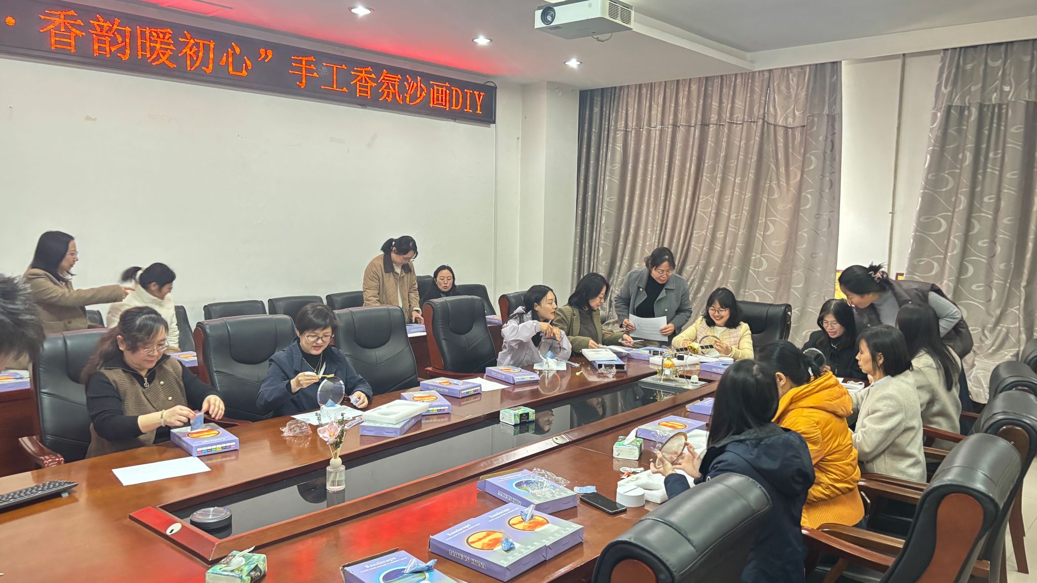 本次活动DIY制作香氛沙画小夜灯,院工会为每位女教工精心准备了专属定制材料包,搭配馥郁香氛与多彩细沙,全程安排工作人员现场指导。从沙画铺陈、图案创作,到封层固化、灯体组装,女教工们放下忙碌、静心创作,指尖轻捻细沙,勾勒出专属的创意图案,在氤氲的香氛与舒缓的轻音乐中,沉浸式感受手工创作的乐趣与治愈。活动现场氛围温馨融洽,大家相互交流、分享创作灵感,欢声笑语不断。