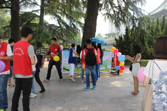 青年志愿者协会在兴庆公园开展了“绿色出行,环保你我他”宣传活动。本次活动由蚂蚁足球