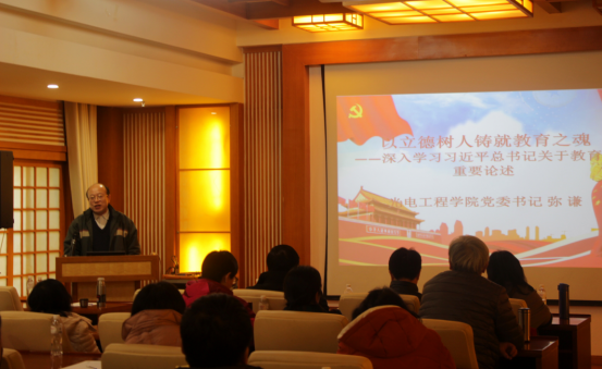 他指出,党的十八大以来,习近平总书记先后到各级各类学校考察并同师生们座谈,给大中小学生和老师回信,主持召开一系列重要会议研究教育工作,作出了一系列重要讲话、指示、批示,提出了一系列新理念新思想新观点,形成了系统完善的新时代中国特色社会主义教育理论体系,是我们做好教育工作的行动指南和根本遵循。我们一定要把学习领会习近平总书记关于教育工作的重要论述与学习贯彻习近平新时代中国特色社会主义思想结合起来,坚持德智体美劳全面发展的育人导向、坚持为学生终生发展奠基的价值取向,不断培养一代又一代社会主义建设者和接班人。教育是国之大计、党之大计,教育的根本任务是立德树人,全体教师党员要在以习近平同志为核心的党中央坚强领导下,深入贯彻全国教育大会精神,真抓实干,开拓进取,加快推进教育现代化、建设教育强国、办好人民满意的教育。