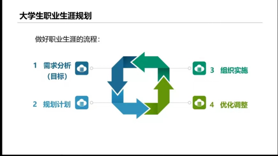隋老师以职场人的视角,分析年龄差异下的职场现状与变革,社会发展与职业规划关系,重点讲解了职业生涯规划四流程:需求分析,规划计划,组织实施和优化调整;以及做好职业生涯的五个参考维度:个人、体制、行业、公司、岗位。高屋建瓴,从顶层设计到微观落实,不仅给学生普及了职业生涯规划的知识,更是拓展了学生看问题的视角,引发学生对人生职业理想的思考。