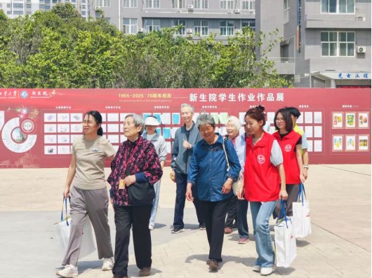 的志愿者们还主动承担起“校园导览员” 的重要职责。他们带领校友们驻足学校展览牌前,以生动的语言、真挚的情感,讲述着学校七十年风雨兼程的发展历程。从初创时的艰辛探索,到如今的蓬勃发展,每一个故事都引发了校友们的强烈共鸣,勾起了大家对校园生活的美好回忆。