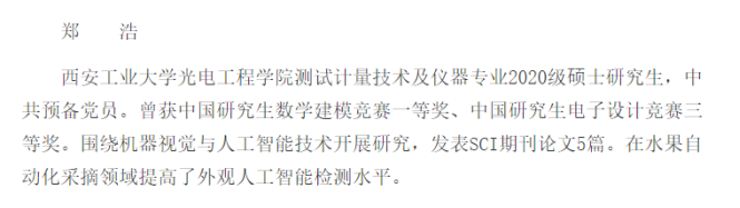 郑浩,西安工业大学光电工程学院测试计量技术及仪器专业2020级硕士研究生,中共预备党员,2022年硕士研究生国家奖学金获得者。